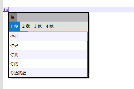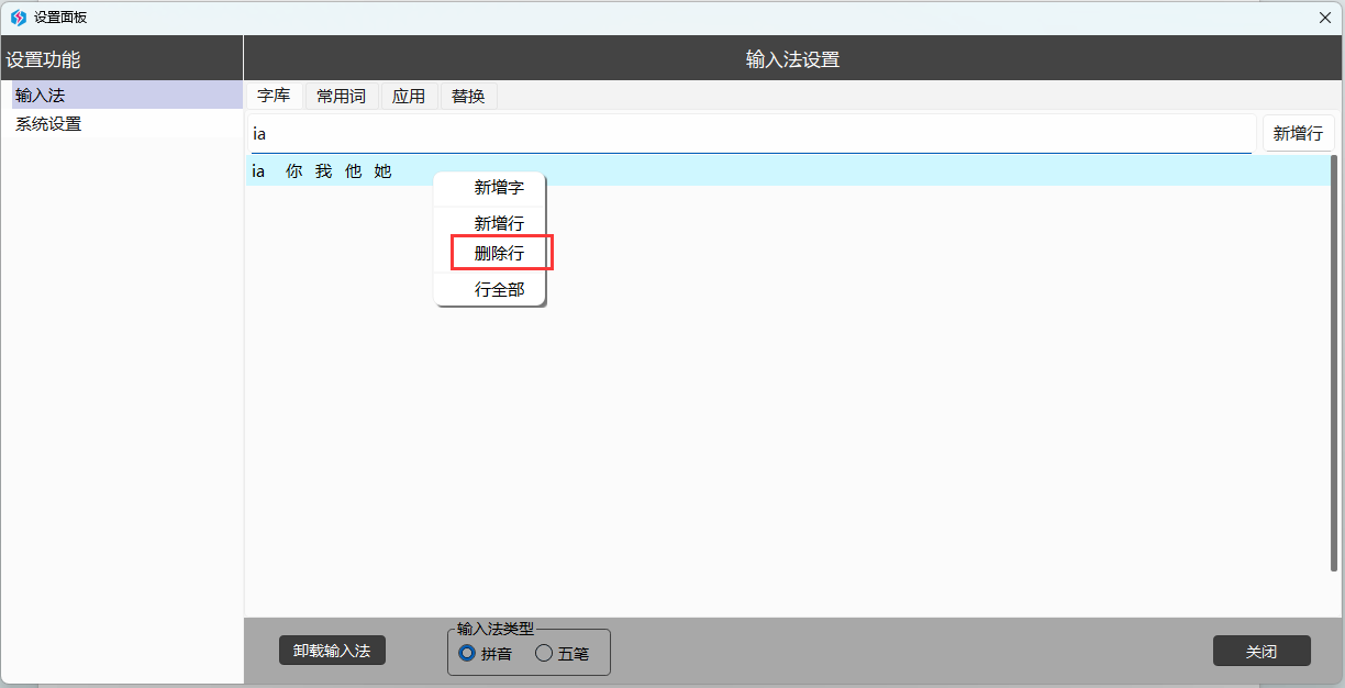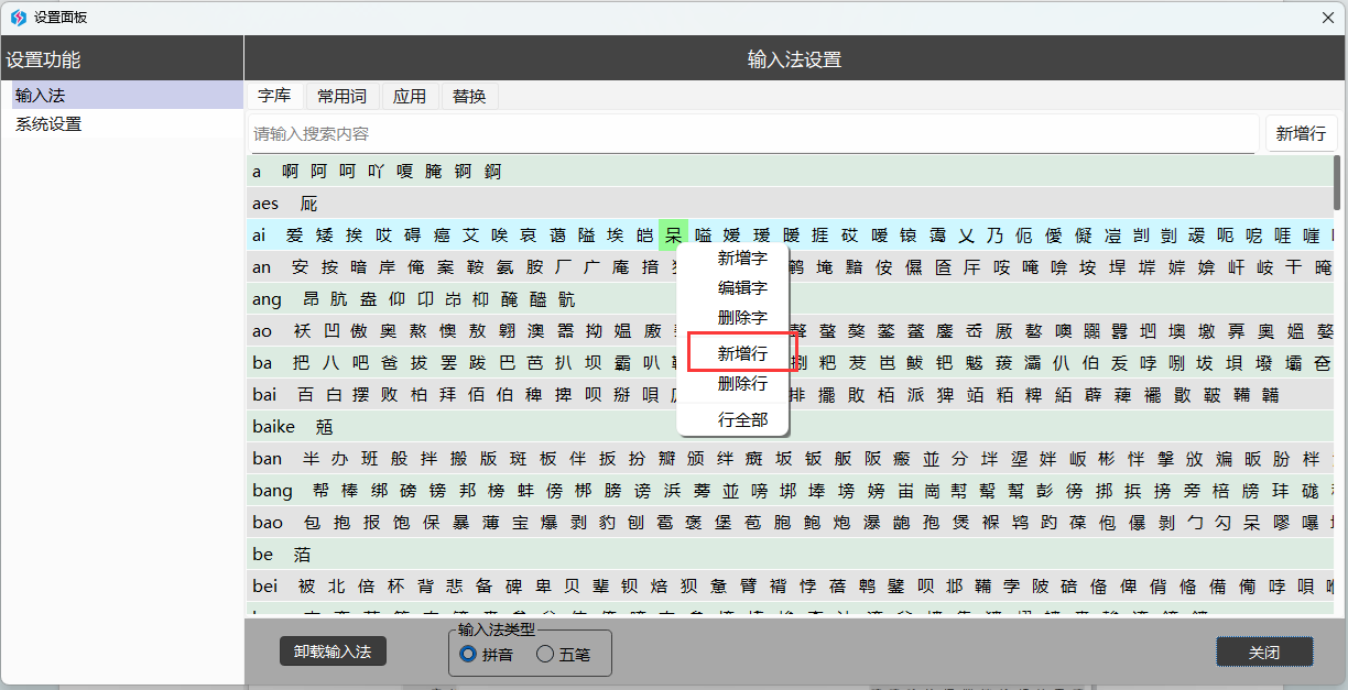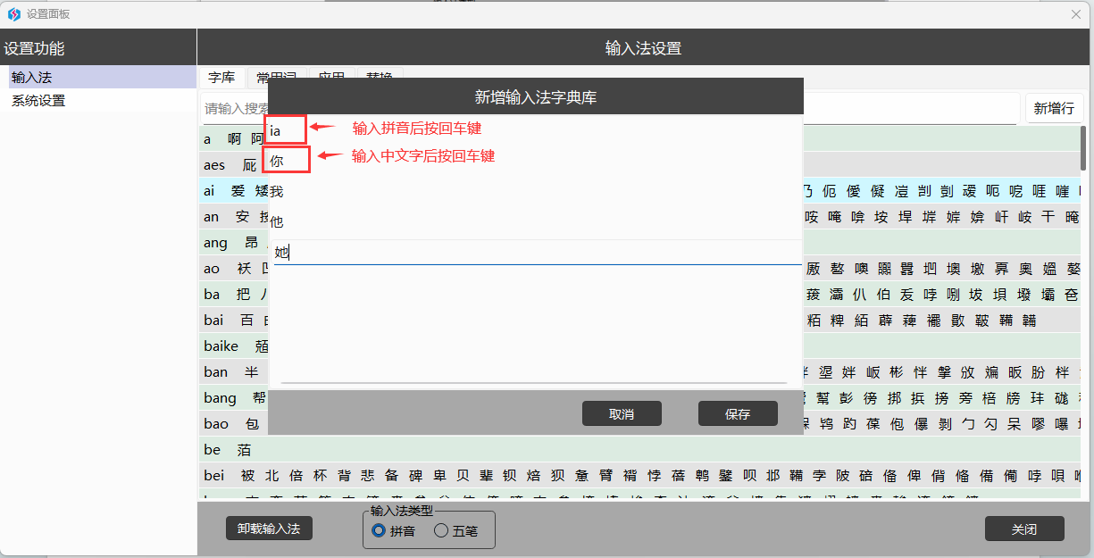 新增行就是新增拼音和对应的字,比如新增拼音 ia对应的字是 你;我;他;她(当然实际是没有这样的拼音,但本输入法支持您这样修改,毕竟您的输入法您做主),操作过程如下图所示。