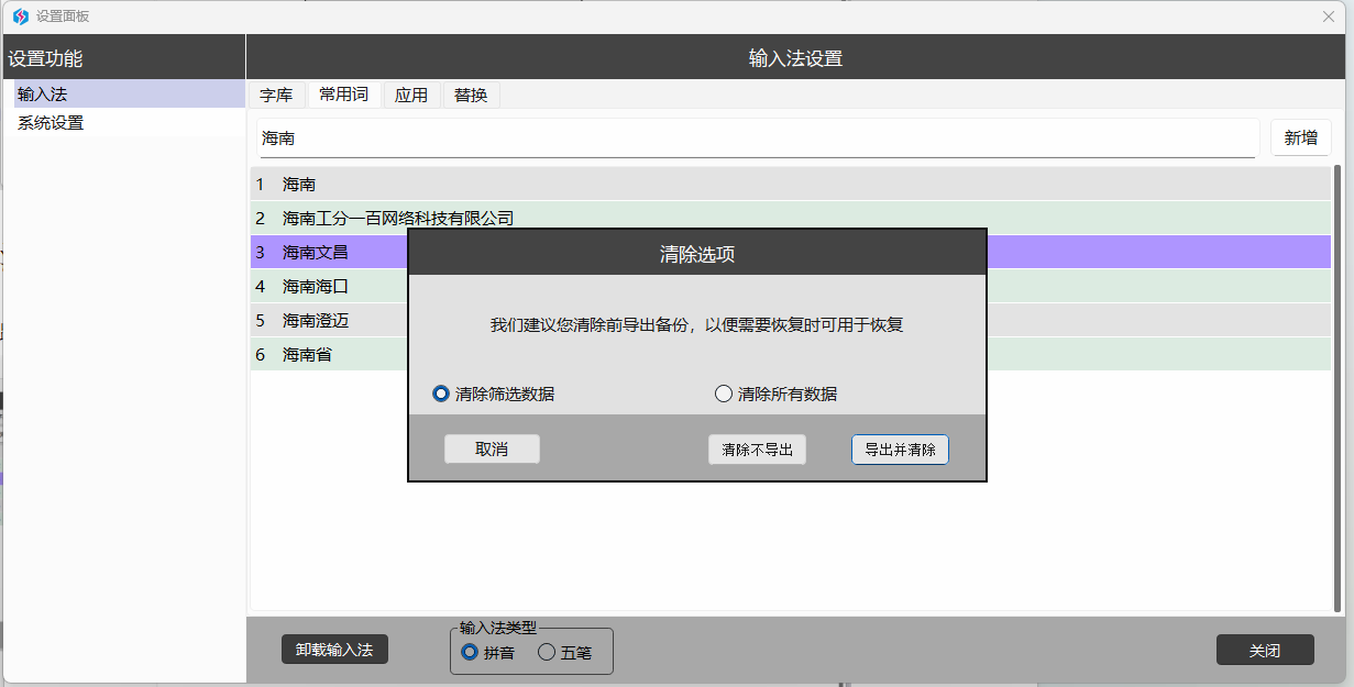 跟“删除”功能一样,清除是批量把常用词从字库删除,清除界面如下图所示。