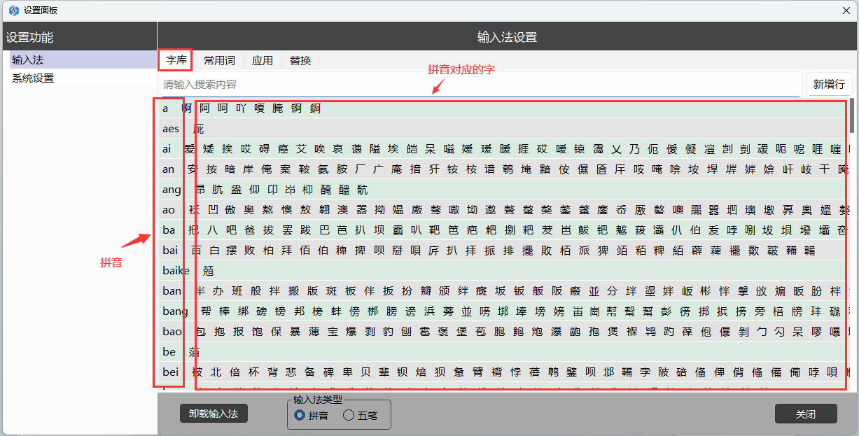 一、可添加/删除/修改字库,也可按自己的喜好修改拼音跟字之间的对应关系,虽然不建议不样做。