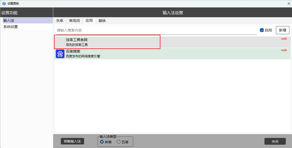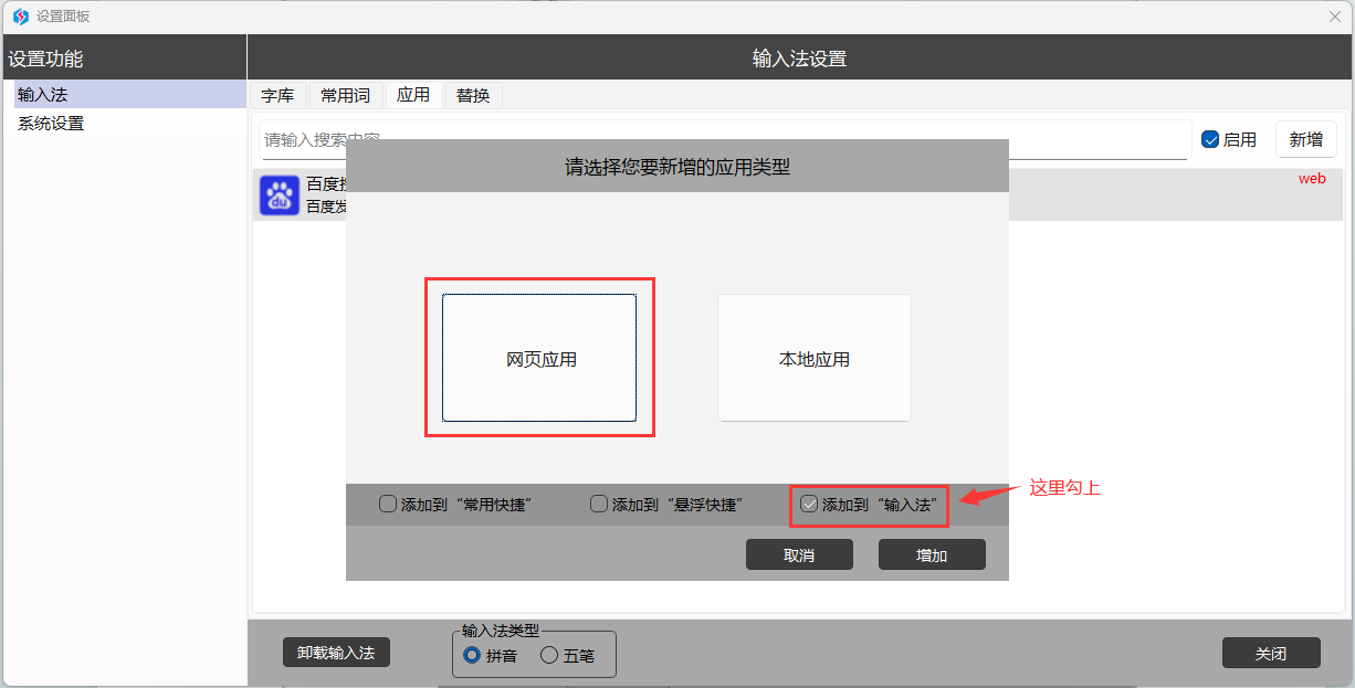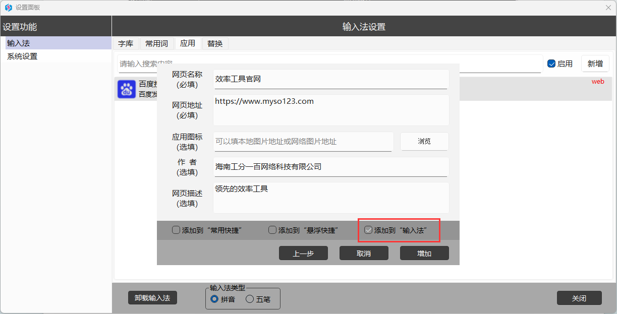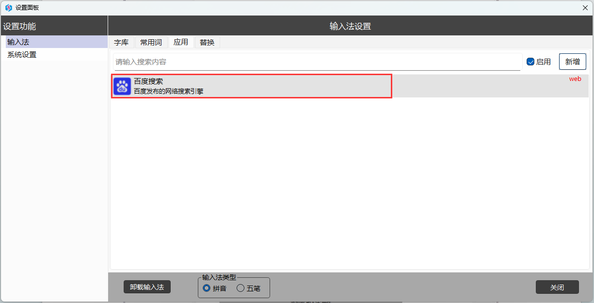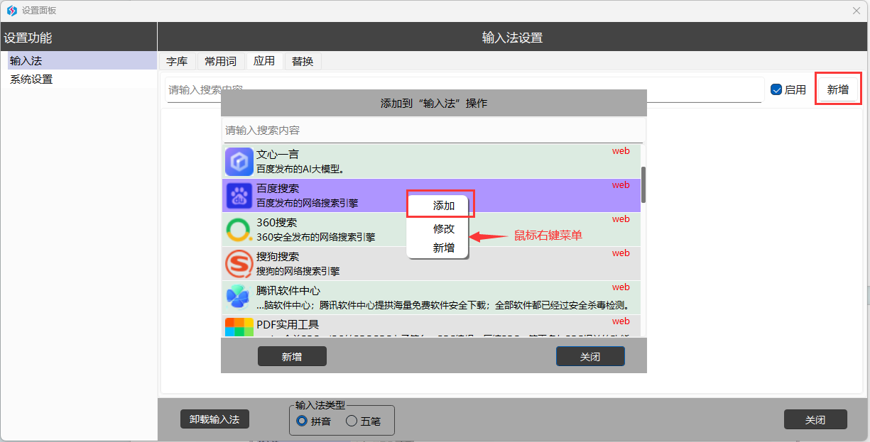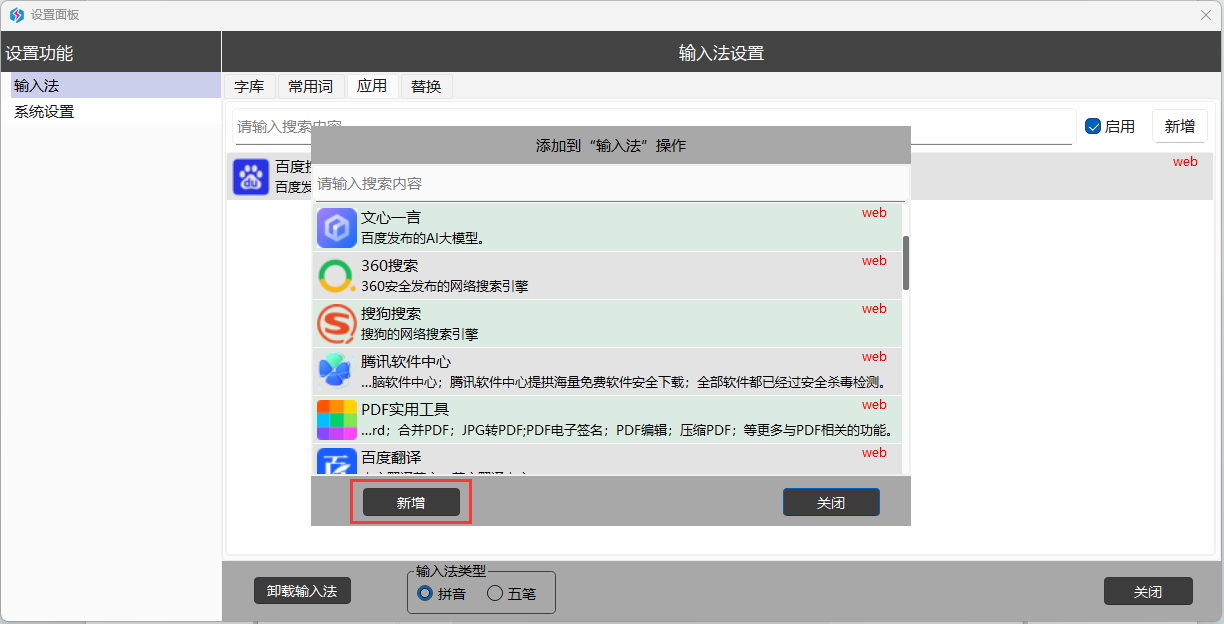 点击“新增”按钮,添加一个应用到输入法,比如本示例添加“百度搜索”,操作过程如下图所示。