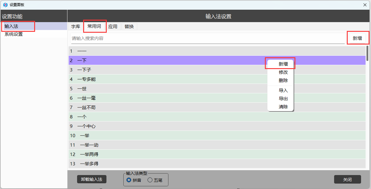 选择“常用词”页签,鼠标右键菜单或点击“新增”按钮,如下图所示。