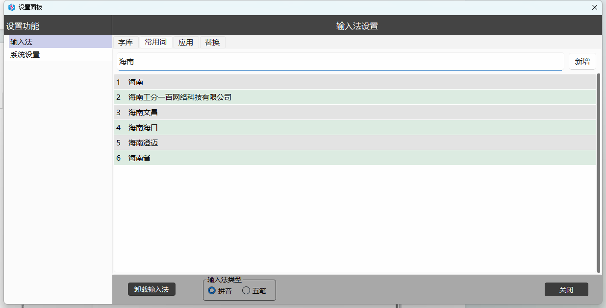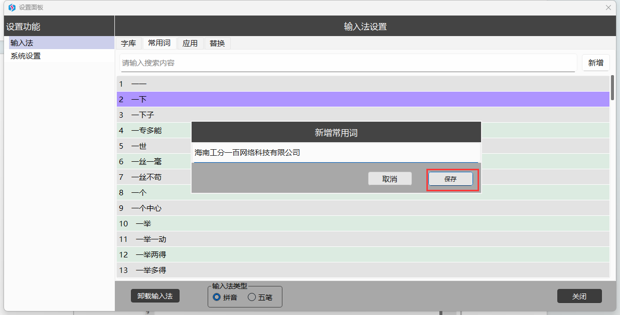 我们以新增“海南工分一百网络科技有限公司”到常用词为例,如下图所示。