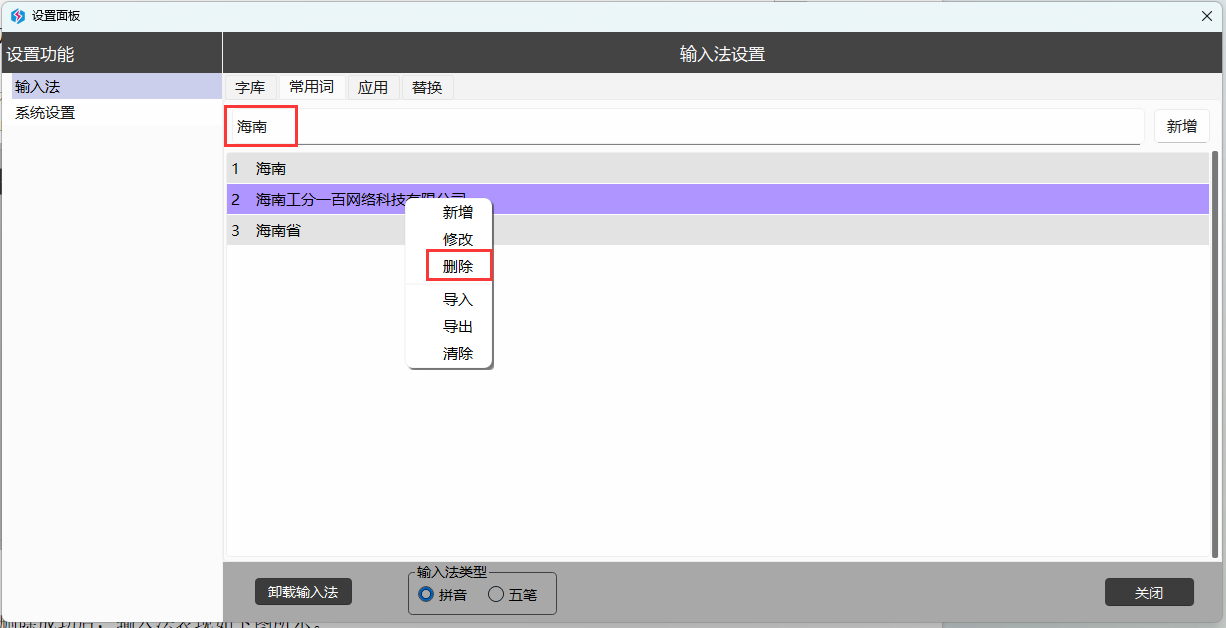 在常用词搜索框中输入关键字,筛选出您了删除的常用词,在要删除的常用词行鼠标右键菜单,如下图所示。