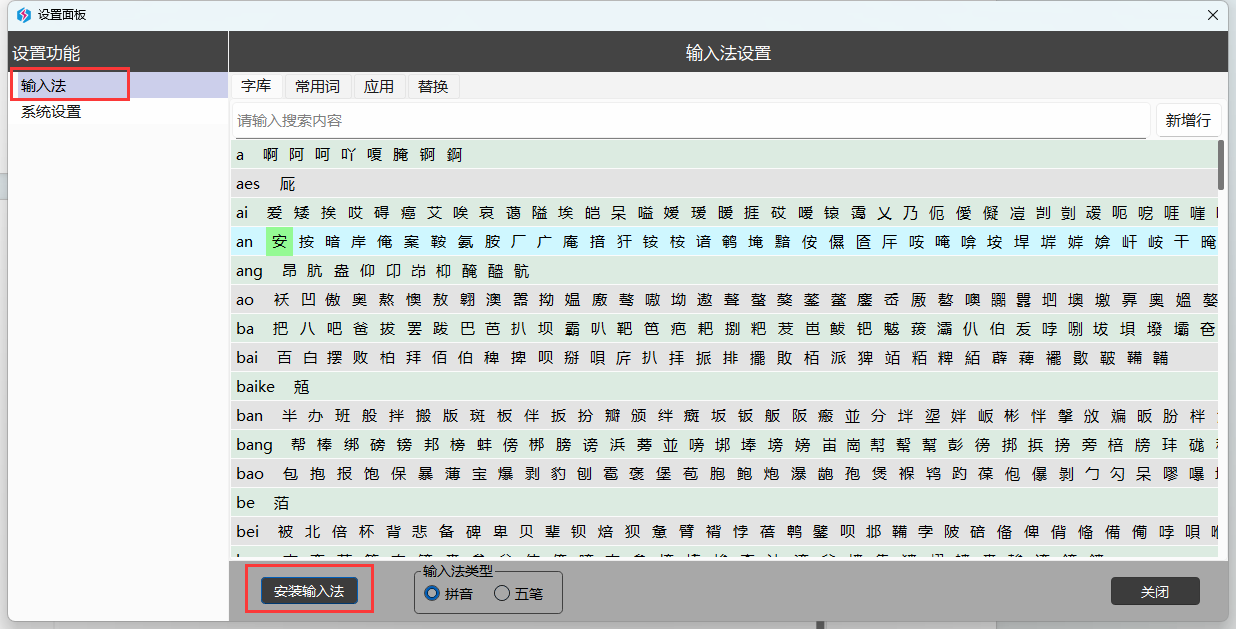 相对于常用词,字库一般很少修改,但是在发现少字,拼音和字对应错误时也可以修改,甚至您可以根据自己的喜好修改,字库界面如下图所示。