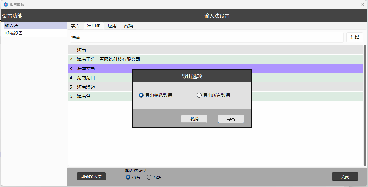 如果需要分享自己的常用词库给别人或备份,可用导出功能批量导出。