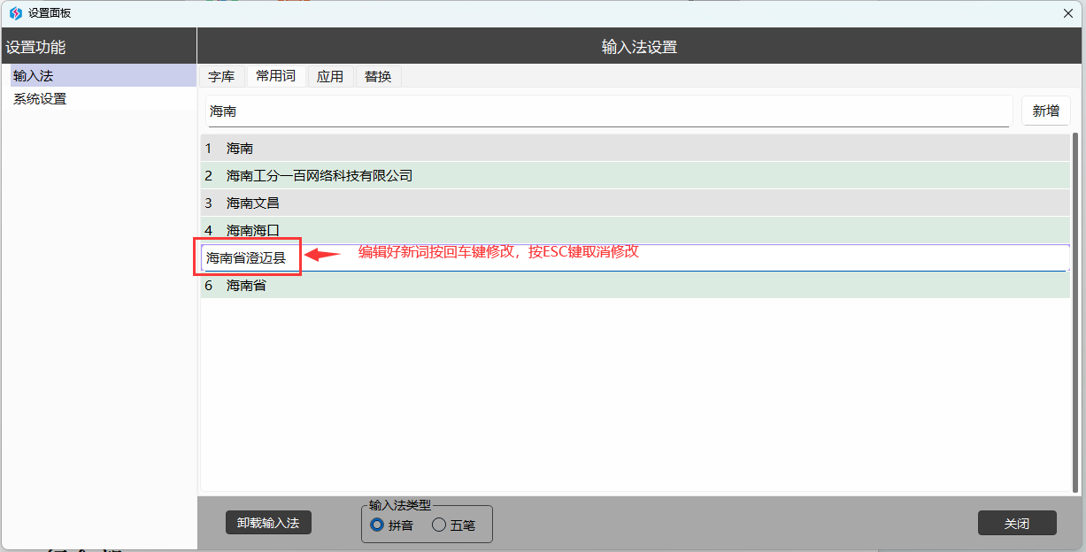 对指定常用词修改,操作逻辑是删除旧词,新增修改后的新词。操作过程是编辑好新词,按回库即可,如下图所示。