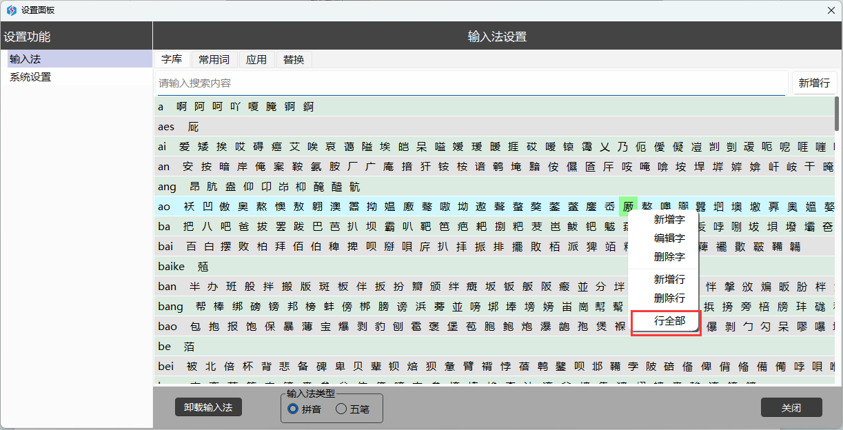 如果本拼音字太多,一行显示不完,鼠标右键菜单“行全部”可显示所有字,如下图所示。