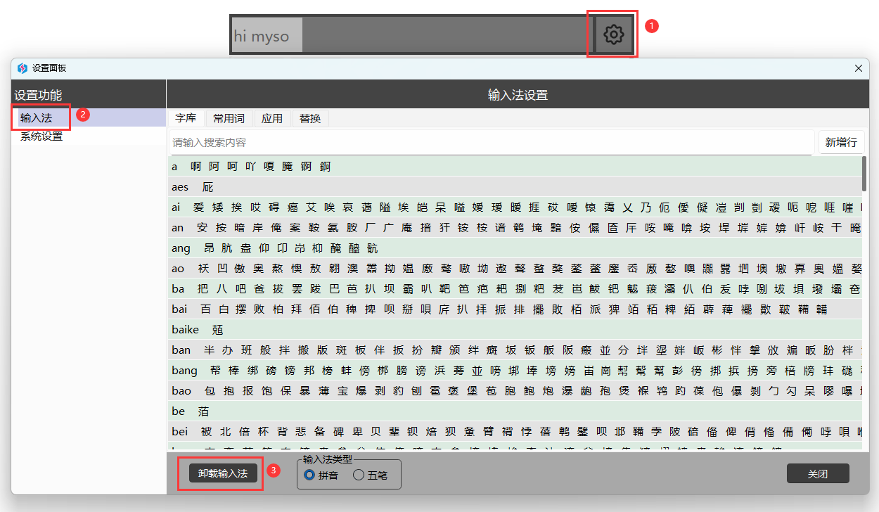 如果您已经安装了MYSO高效输入法,那卸载MYSO前,需要先卸载输入法,卸载输入法操作过程如下图所示,卸载完输入法后再按普通卸载流程卸载本软件。