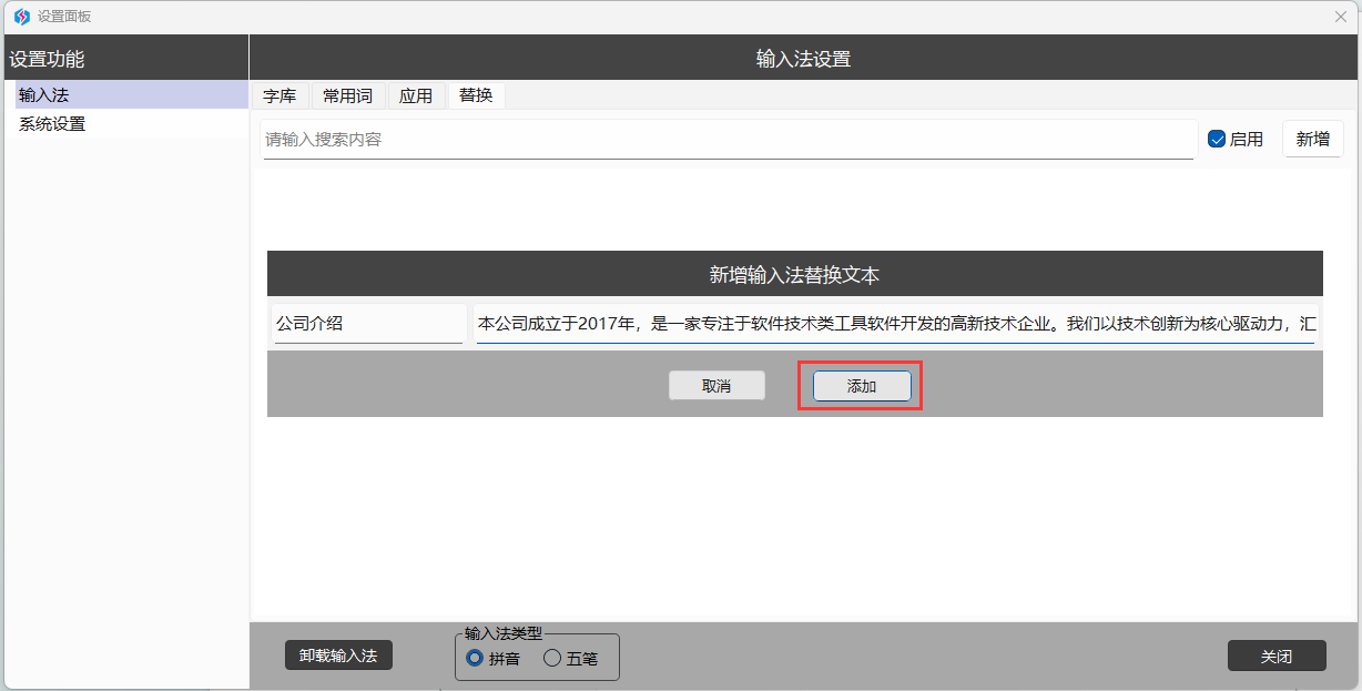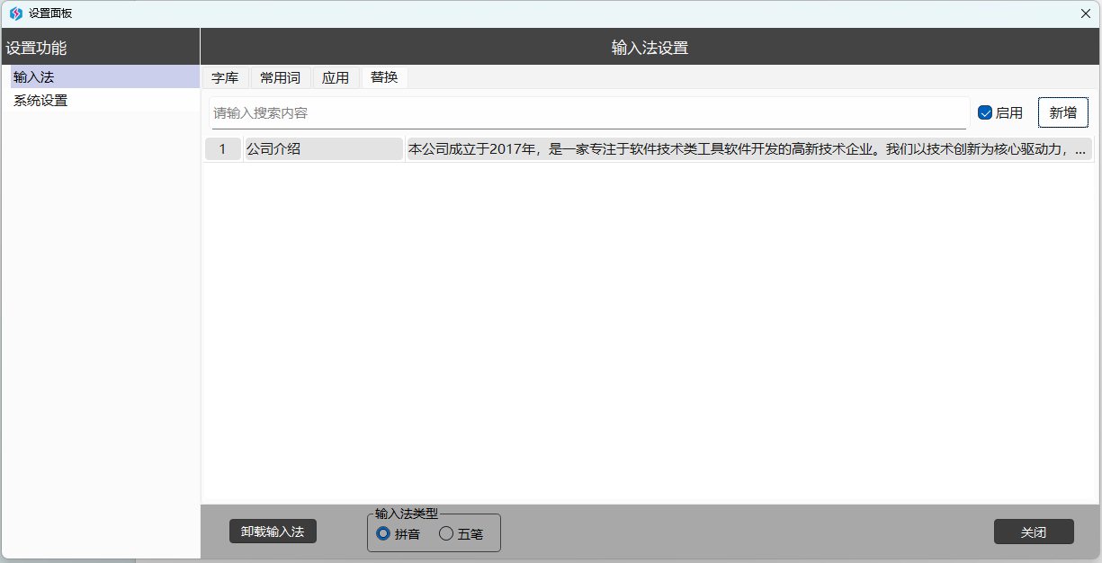 替换功能是输入法检索和显示简短名称,输入替换成另外的实际值,本功能特别适合客服用户使用。比如公司介绍: