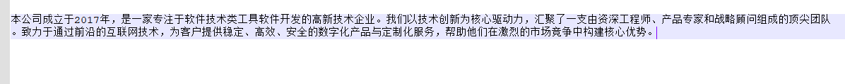 “本公司成立于2017年,是一家专注于软件技术类工具软件开发的高新技术企业。我们以技术创新为核心驱动力,汇聚了一支由资深工程师、产品专家和战略顾问组成的顶尖团队。致力于通过前沿的互联网技术,为客户提供稳定、高效、安全的数字化产品与定制化服务,帮助他们在激烈的市场竞争中构建核心优势。”